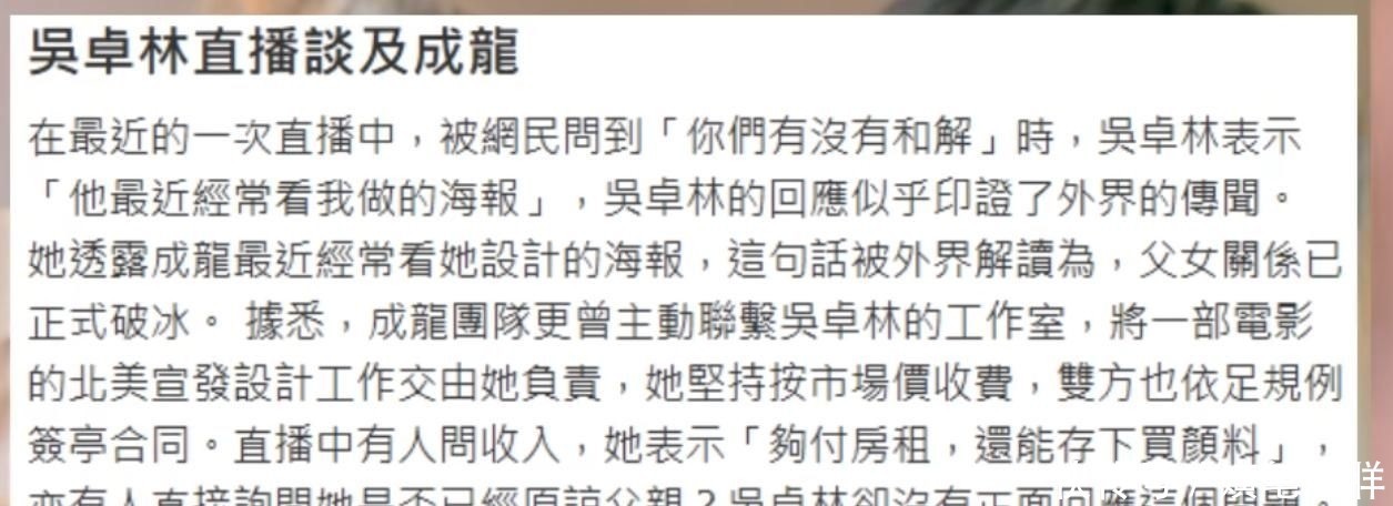 另有传闻指出,成龙近年更新遗嘱内容,已将吴卓林列入受益人名单,甚至为她设立了数额高达数亿港币的信托基金。