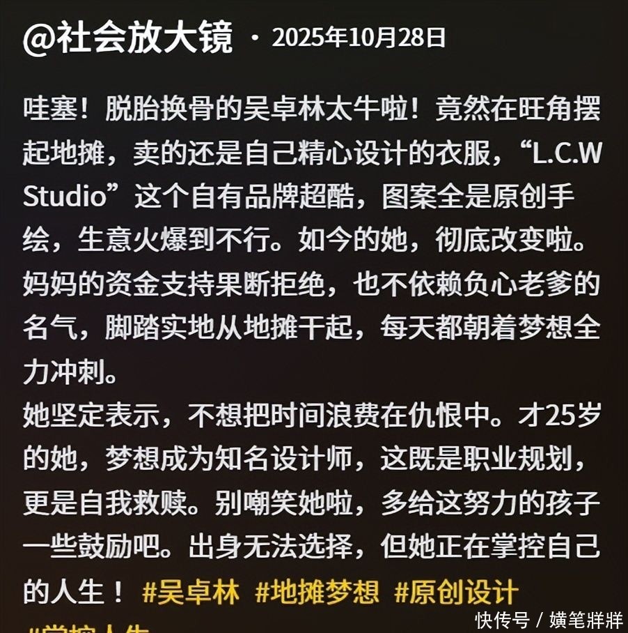 无论是工作室日常运营还是夜市摆摊,她始终坚持独立处理;当被问及与成龙有关的话题时,也只是平静地说一句:“要赚钱吃饭嘛。”